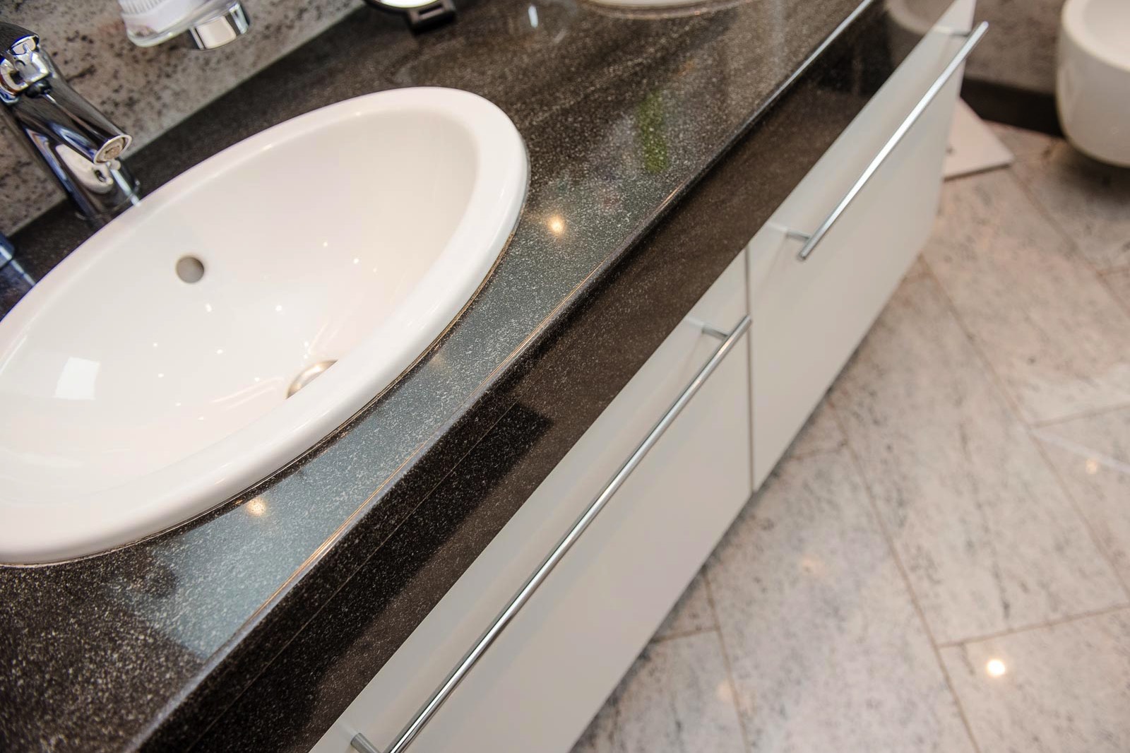 Eine Waschtischplatte aus Naturstein ist elegant und robust. Bei Beratung und Aufmaß vor Ort sprechen wir alle Details mit Ihnen ab. Nach kurzer Fertigungszeit setzen wir Ihre Waschtischplatte sauber und fachmännisch ein. Suchen Sie sich an der Rohplatte Ihr gewünschtes Stück für diese dauerhafte Lösung in Bad und Gäste-WC aus. Auf Wunsch kombinieren wir auch mit keramischen Fliesen.